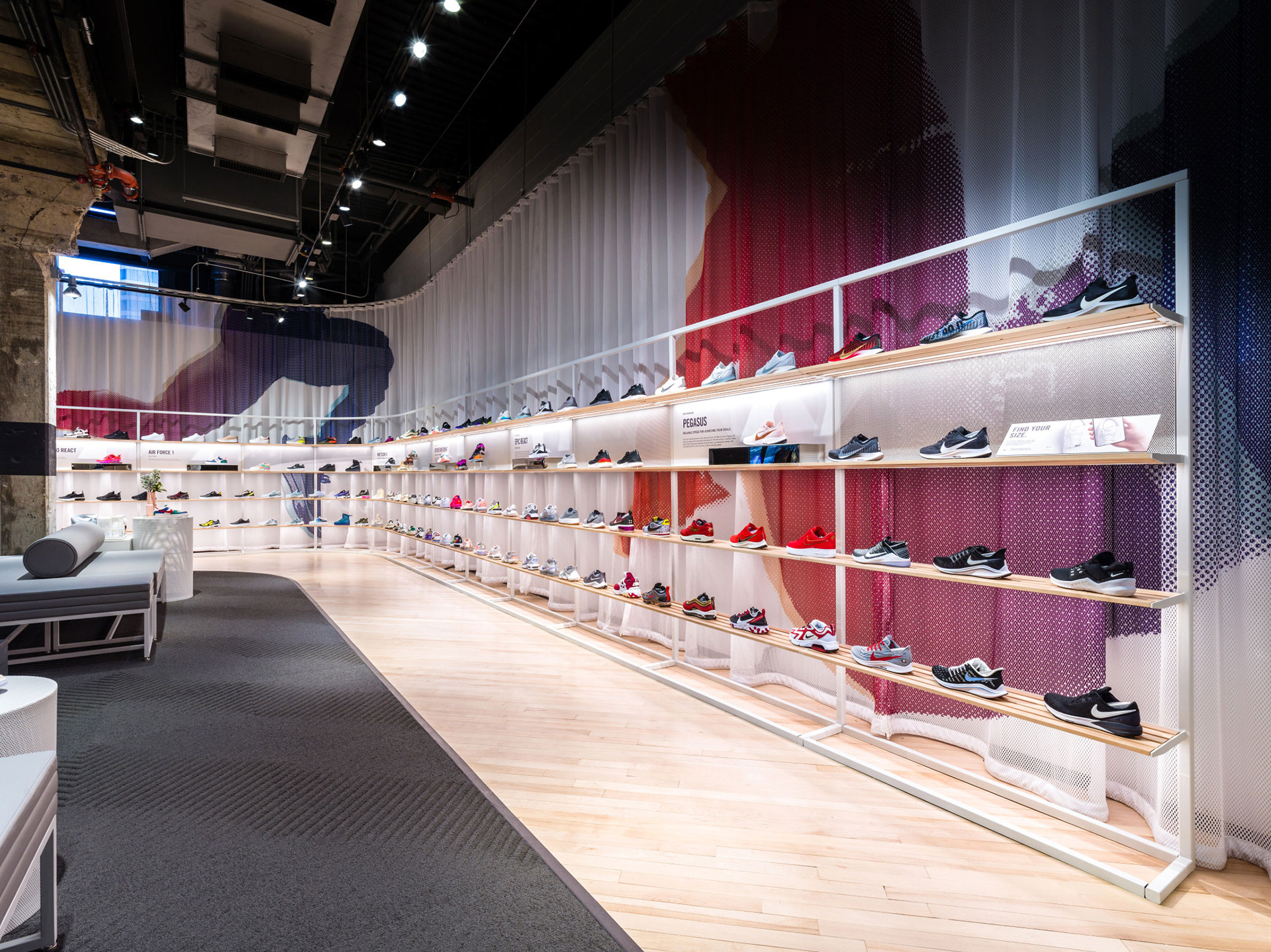 This end-to-end remodel brought in elements of stadiums and arenas to amplify the excitement that Atlanta has towards all things sports and sneakers. The overhead lighting was designed to tap into the visual elements of speed. The Jumbotron served as a beacon to the sweeping footwear wall and service desk. And larger-than-life athlete graphics were designed to appear to move when combined with localized colors.