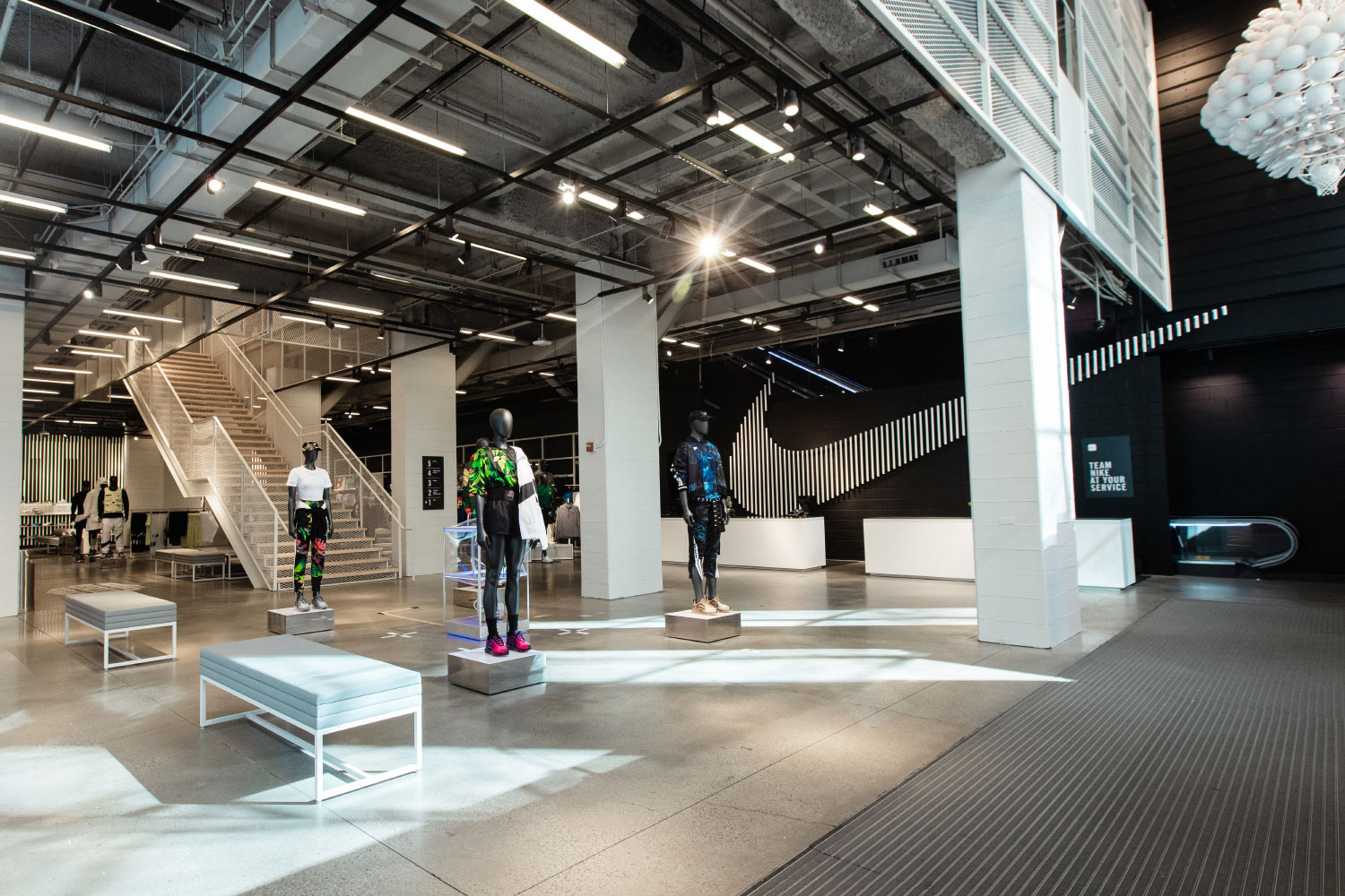 Located on the Miracle Mile in Chicago, this four-story Nike store was completely remodeled from end-to-end. Featuring a custom designed dichroic lenticular footwear wall and oversized swoosh sculpture that activates when you move through the space, and the highly-instagrammed LED neon light sculpture that became a must-have in store remodels to come.
